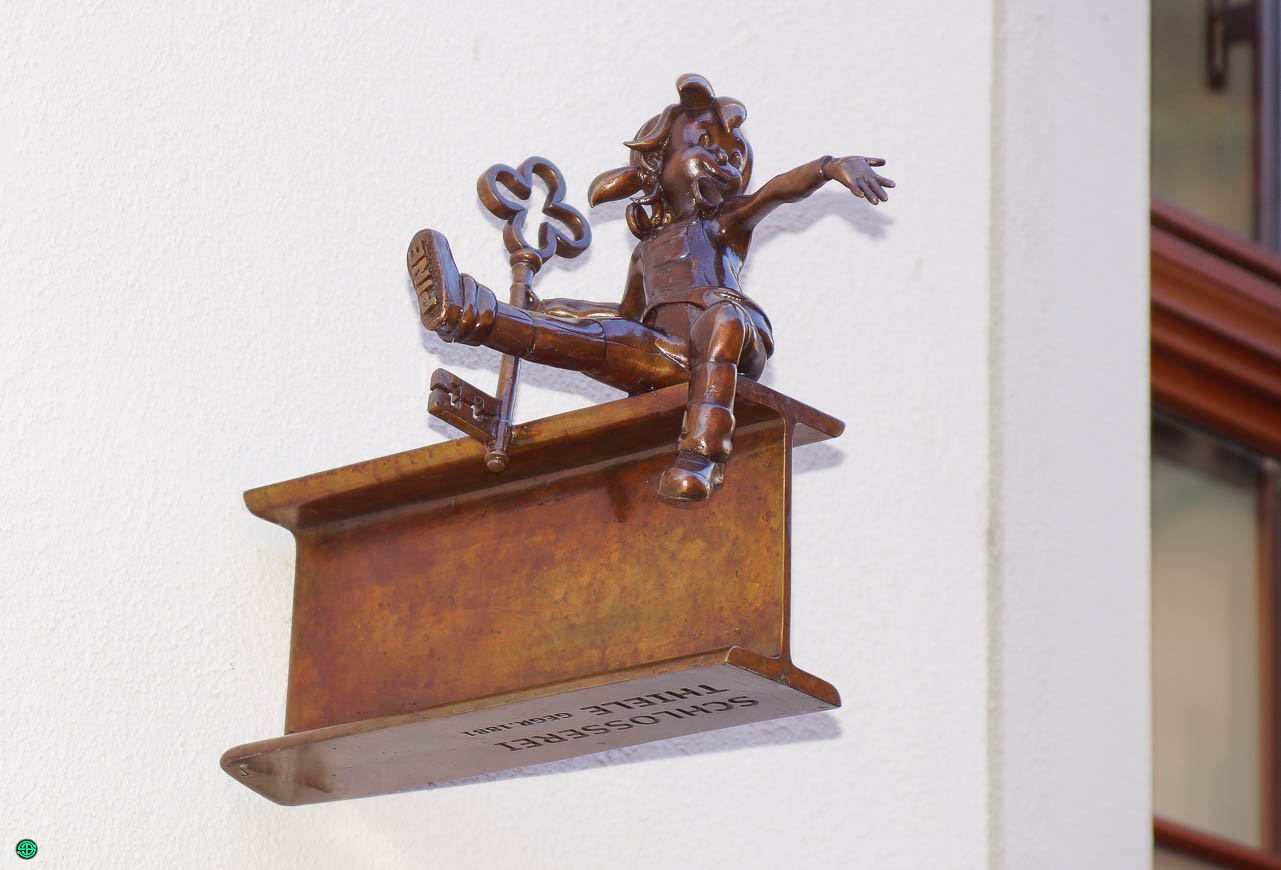 In der Schmiedestraße eine Pine der 1881 gegründeten Schlosserei Thiele. Die Pine zeigt auf das Haus, in dem die erste Werkstatt war.