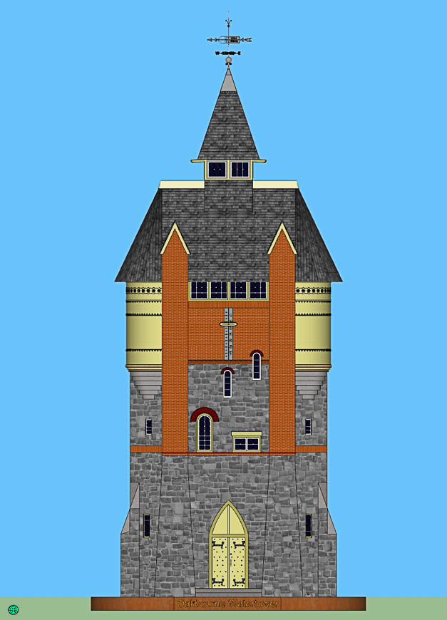 Von vorn, mit Konstruktionskanten, die in den Fenstern Feinheiten überdecken, ohne Schatten, Parallelperspektive.