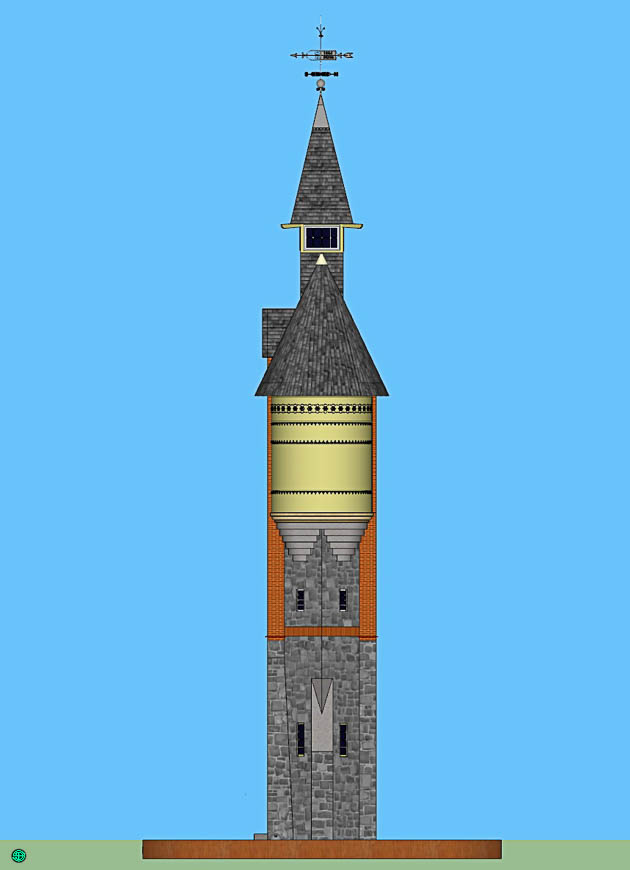 Von rechts, mit Konstruktionskanten, die in den Fenstern Feinheiten überdecken, ohne Schatten, Parallelperspektive.