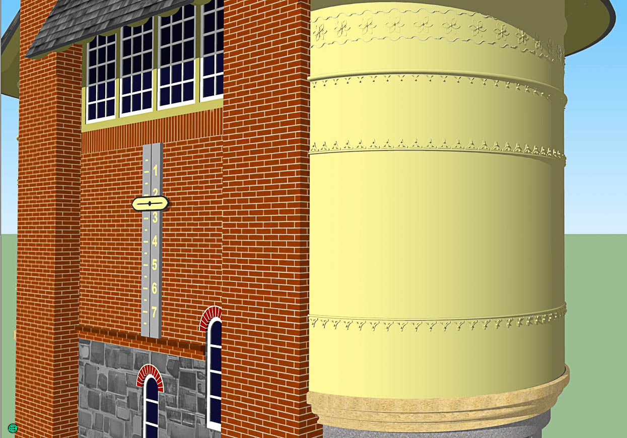 Die hübsch verzierten Wassertanks sind von außen sichtbar. Selten bei gemauerten Wassertürmen.