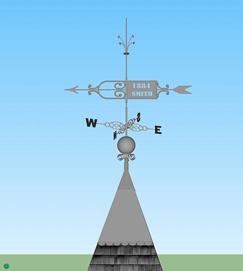 Die Turmspitze mit Turmkugel, Anzeige der Himmelsrichtungen, Windfahne und Blitzableiter.