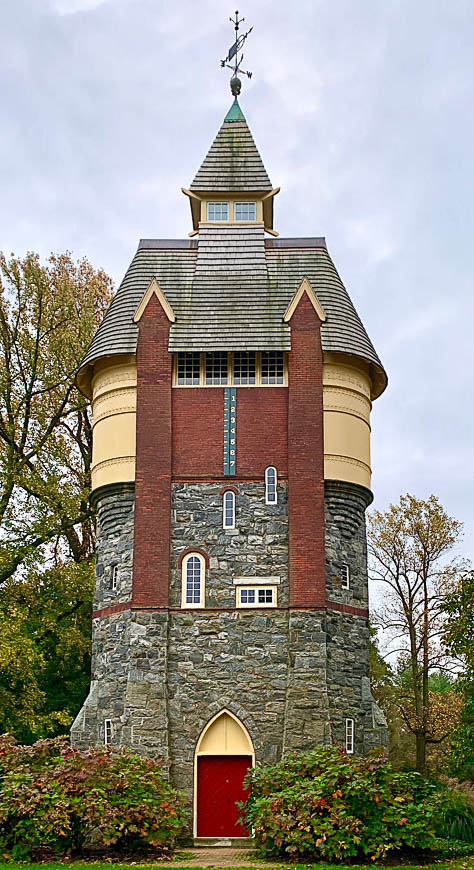 Die Vorderseite des Wasserturms, an beiden Seiten die Wassertanks. Aktuelles Foto mit roter Tür. Autor: David