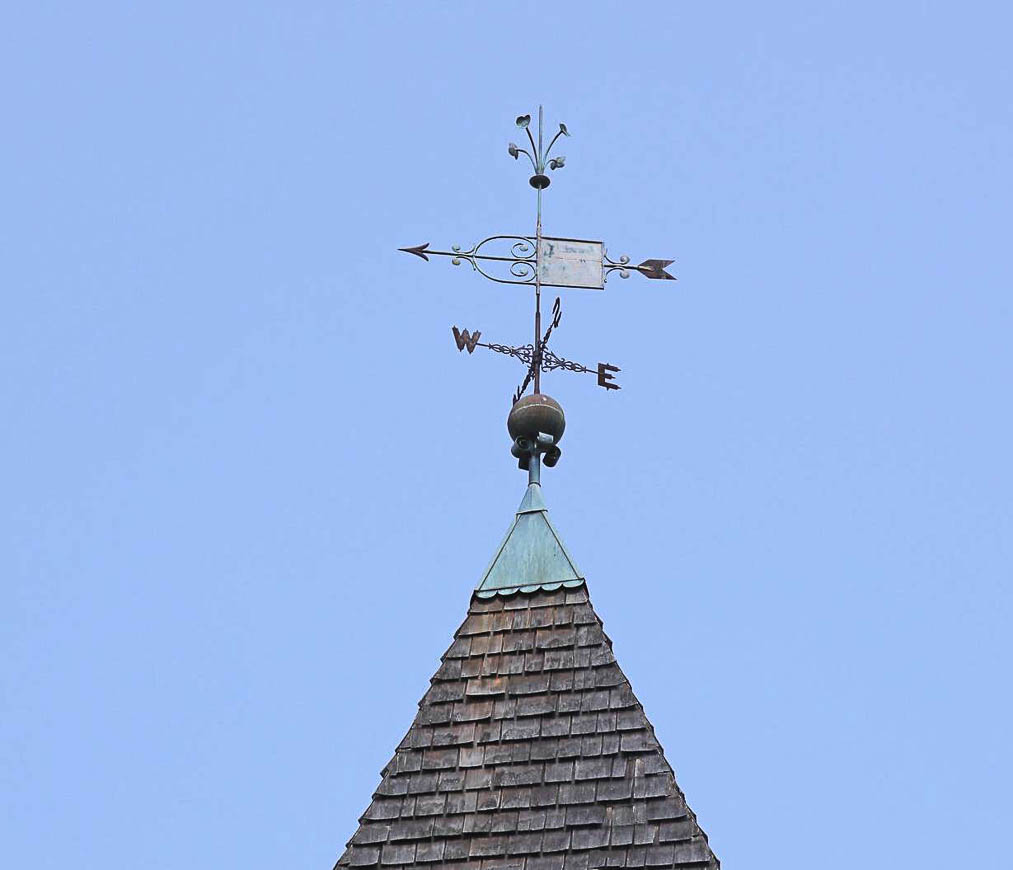Die Turmspitze auf dem Dachreuter mit Turmkugel, Anzeige der Himmelsrichtungen, Windfahne und Blitzableiter.