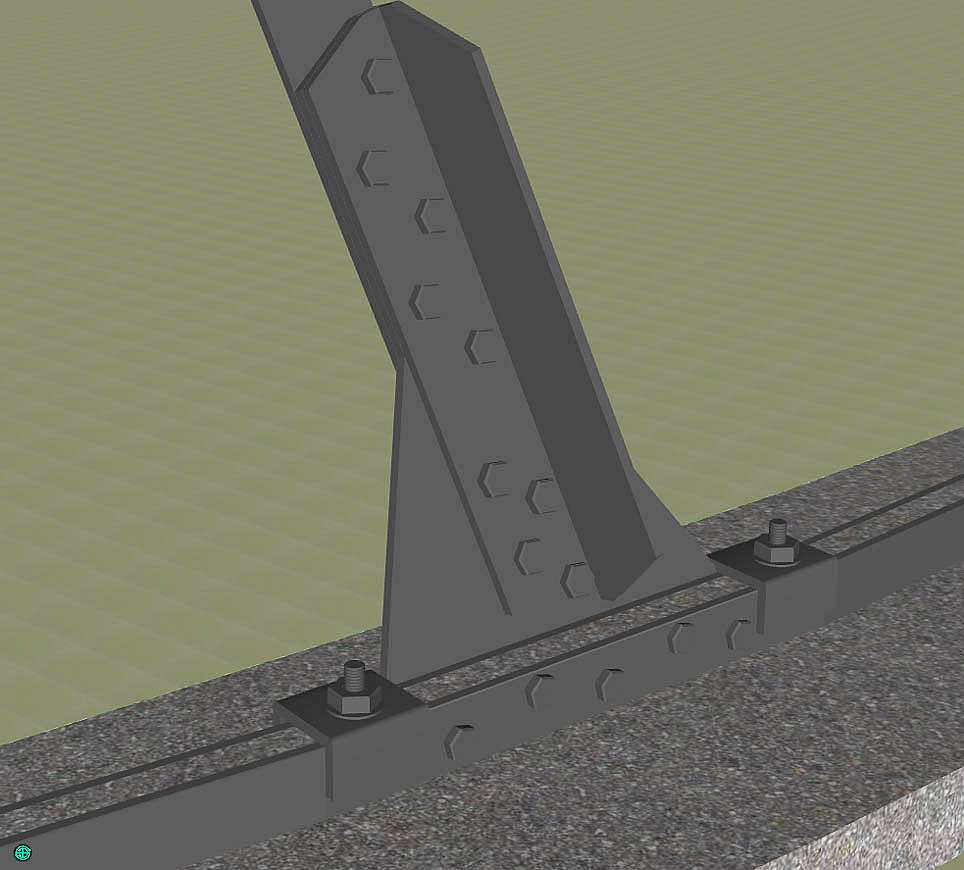 Der Mast steht auf einem Beton-Ringfundament mit 32 Meter Durchmesser, in das zwei Winkelstahlringe eingelassen sind. An diese sind die tragenden Streben angeschaubt.