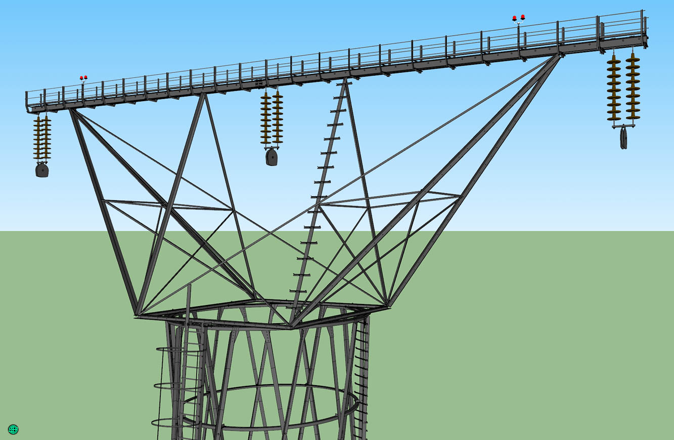 Die Traverse trägt drei Isolatoren-Paare mit den Rollen für die Leiterseile. Wer würde es wagen, 125 Meter über dem Boden die Einholmleiter nach ganz oben zu steigen?