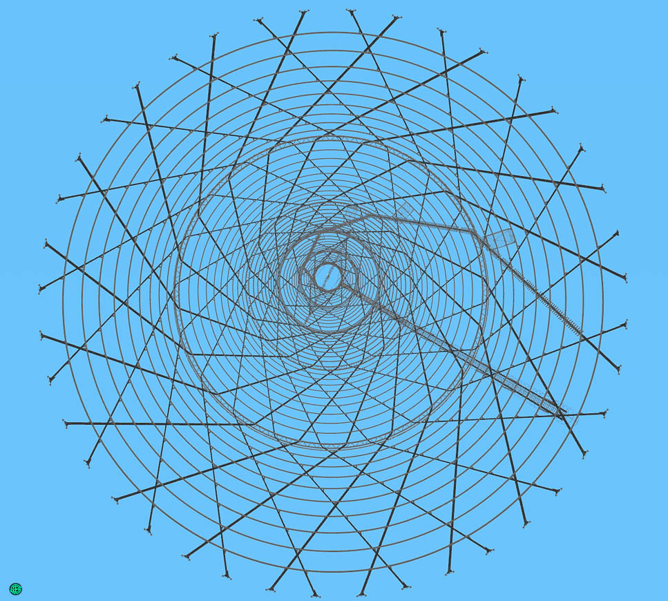 Die imposante Stahlkonstruktion im Blick von ganz unten hoch zur Traverse.