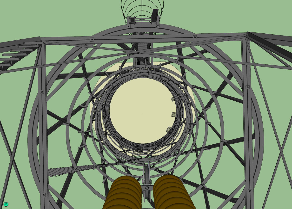 Oben angekommen kann man diesen Blick nach unten genießen. Zur Verdeutlichung mit Konstruktionskanten.