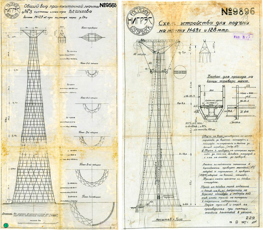 Die einzige erhaltene Zeichnung Schuchows zum 128-Meter-Mast. Diese Höhe wegen einer kreuzenden 110-kV-Leitung. Rechts ein 69,5-Meter-Mast.