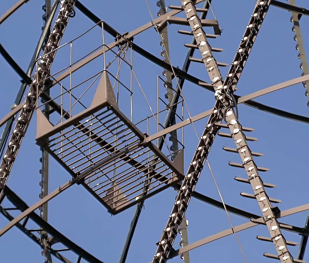 In verschiedenen Höhen wurden neben der Einholmleiter fünf dieser Ruhepodeste eingefügt. Der Monteur auf dem nächsten Bild nutzt sie aber nicht.