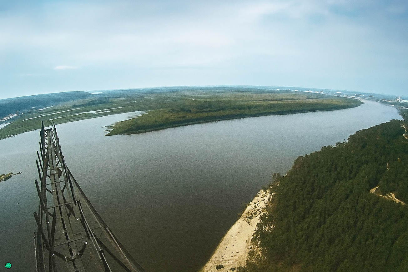 Da hinten kommt die Oka ins Bild, fließt in großem Bogen an Dserschinsk vorbei und knickt am Schuchow-Mast scharf nach Osten ab.